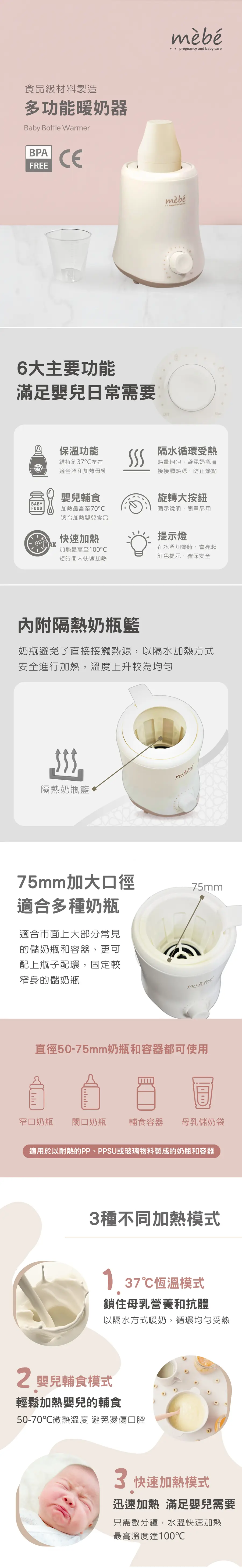 新推出的 mèbé 多功能暖奶器,只有一個控制旋鈕,操作簡易,適用於市面上大部分常見的儲奶瓶和容器。 內置三種不同加熱模式,恆溫設計,能保持水溫,又能避免過度加熱,讓您可以快速、安全地加熱母乳、奶瓶和各類嬰兒輔食飲料,更可以節能的方式持續保持溫暖,以滿足寶寶的日常需要。